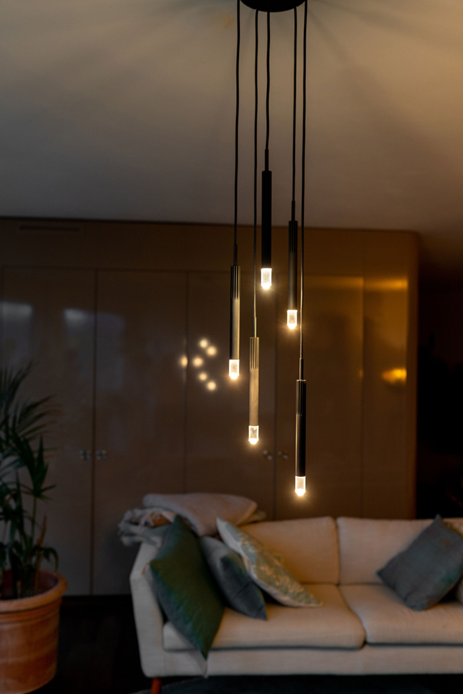 Polished plastic diffusers that break the light are mounted on the slender black chrome-plated brass rods. This is how the light is optimally distributed in the room. The five identical elements can be arranged in different heights. This gives it a playful touch; the warm light evokes associations with floating candles – thus the name.