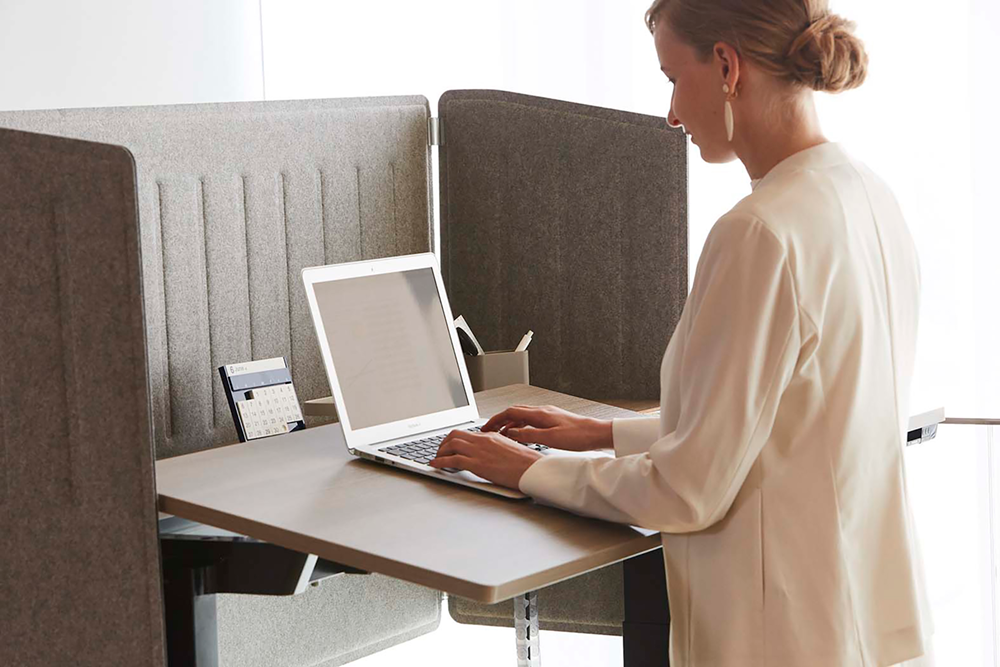 The tilting desktop is surrounded by a flat desktop for cups, pens, monitors etc. For work focus, felt panels made of recycled materials are also available.