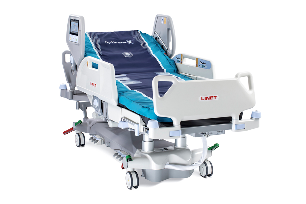 LINET’s new premium ICU bed, Multicare X, with frame-based lateral tilt and innovative constant low pressure mattress, Opticare X.