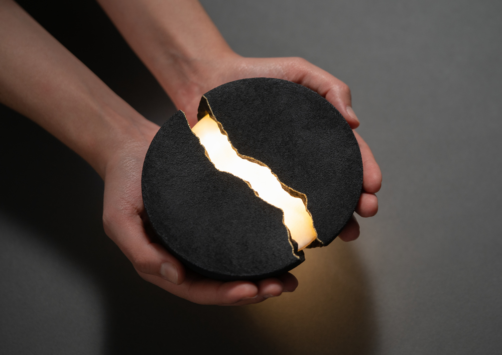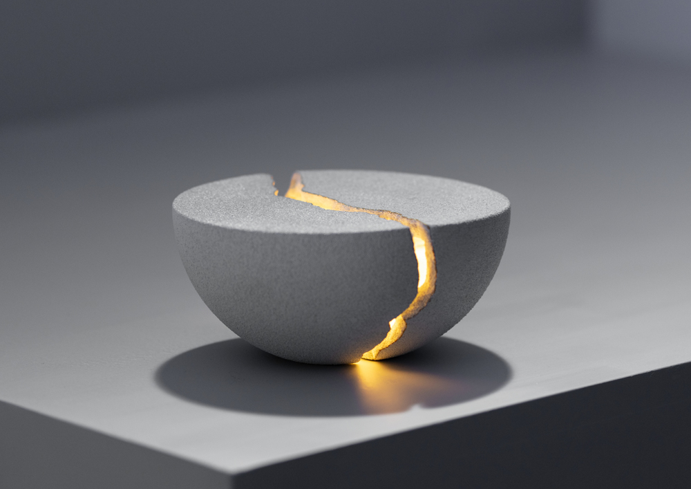 On its surface, Teno is a beautifully crafted bowl sculpture, made from natural sand. When cracked open, it comes alive, revealing soft, warm light that you can adjust with a simple tap. When fully open, it's a powerful speaker, releasing a rich sound that you control through touch.