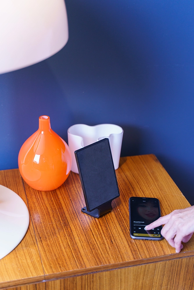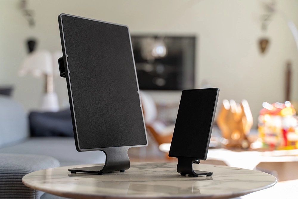 The concept comprises two active digital sound sets, each consisting of two 8 mm thin, super-light smartphone/tablet-sized DML loudspeakers, each driven by a compact subwoofer with an integrated digital DSP amplifier. A 4mm first layer of sustainable balsa harvested from reforested plantations uses advanced micro-vibrations generated by DML technology to create digital sound, covered by a uniquely designed second layer of 4mm acoustic foam. • Held in a minimalist 8mm thin frame with an integrated desk/bookshelf stand, made from machined hard-coated recycled aluminum. Both sound systems feature natural, perfectly balanced, studio-quality 360° omnidirectional sound that is nothing short of impressive with its sonic attention to detail.