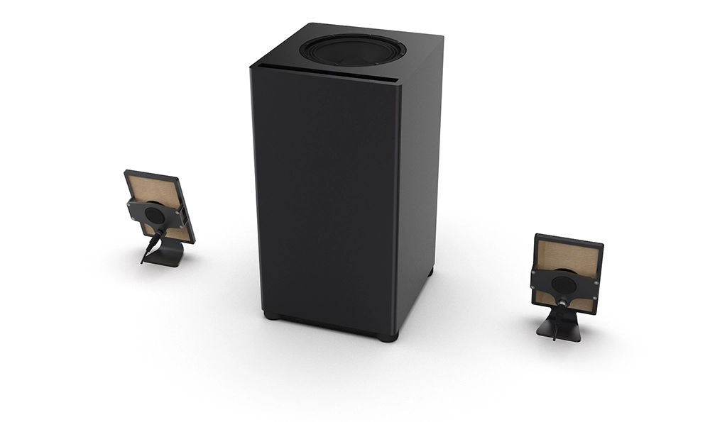 The designers stripped away everything not required by the pure function of sheer sound excellence. The shape of our speakers’ sound-producing area is the golden ratio - the only one that produces high-end sound with DML technology - merely supported with a thin-as-possible aluminum frame to hold the tech together with an integrated foot to stand, not covered at the back. A naked beauty.