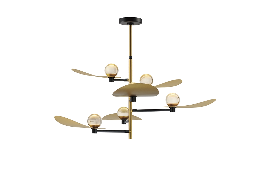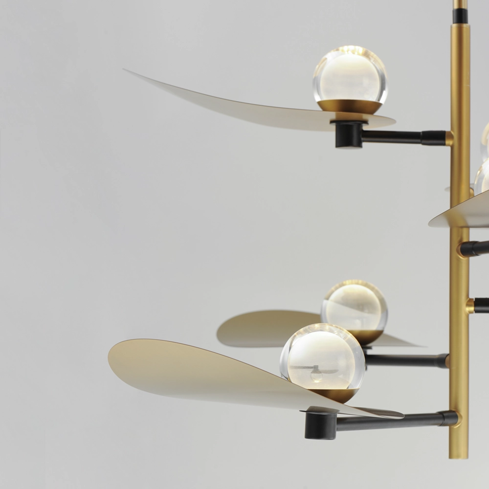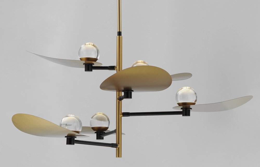 An artistic and flexible design concept, crystal orbs are illuminated behind curved Naturally Aged Brass shades. The oversized panes are mounted to LED light housings that can rotate to provide either ambient indirect lighting that is directed upwards at the crystal for a glowing effect, or these LEDs can be rotated to shine downward for ample lighting. The two-arm wall sconce has a longer extension in the arm with individual light switches on the backplate to be used for directed task lighting great for bedside applications or creating a space within a room that will serve as task lighting.