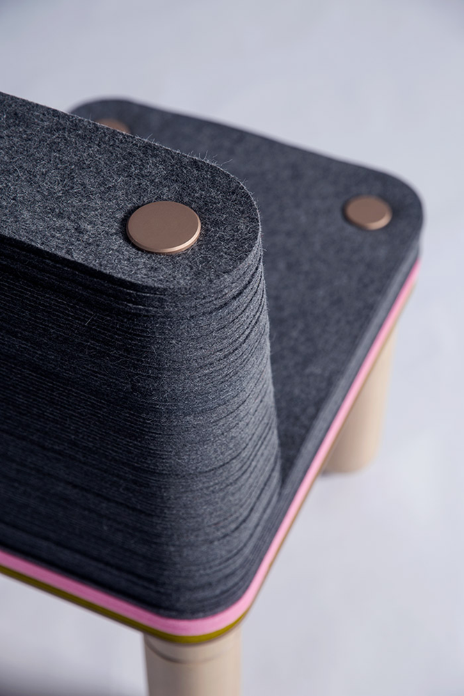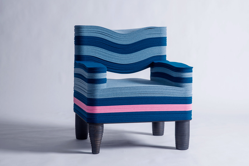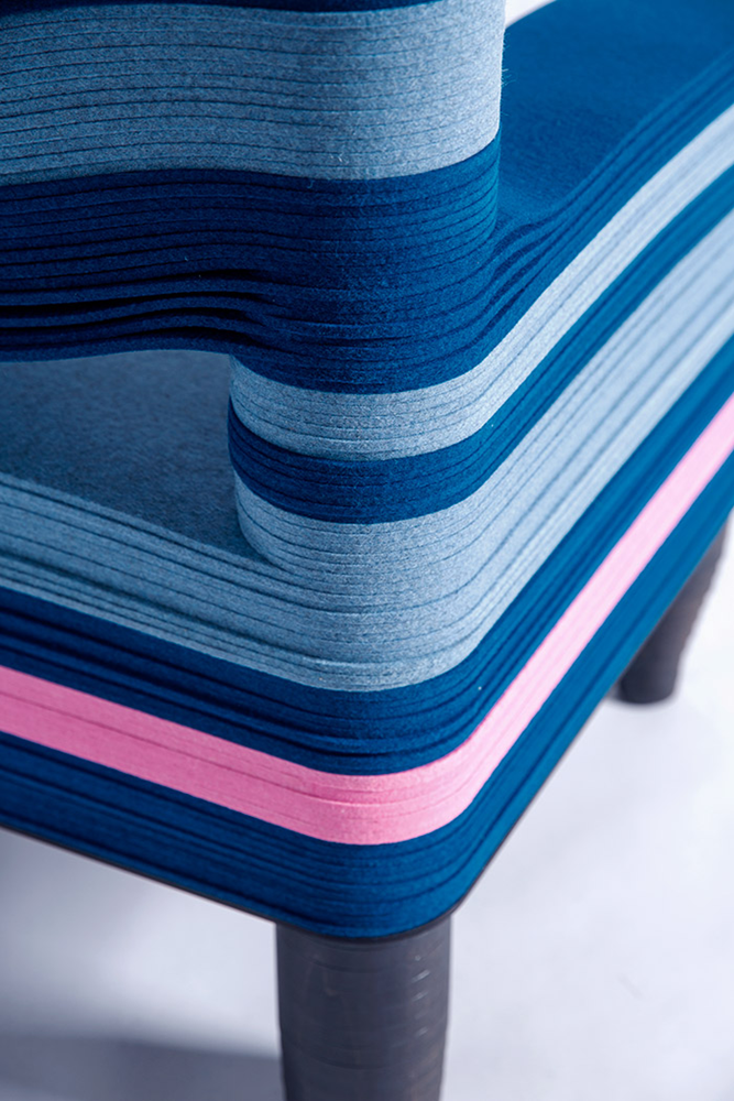 In its first iteration, which debuted at Salon Art + Design 2021, STACKABL offered a selection of manufactured leftovers to choose from: premium Merino wool felt remnants, recycled aluminum, ethically harvested wood, and recycled PET. These materials were then designer-configured into high-end chairs, daybeds, benches, and settees.