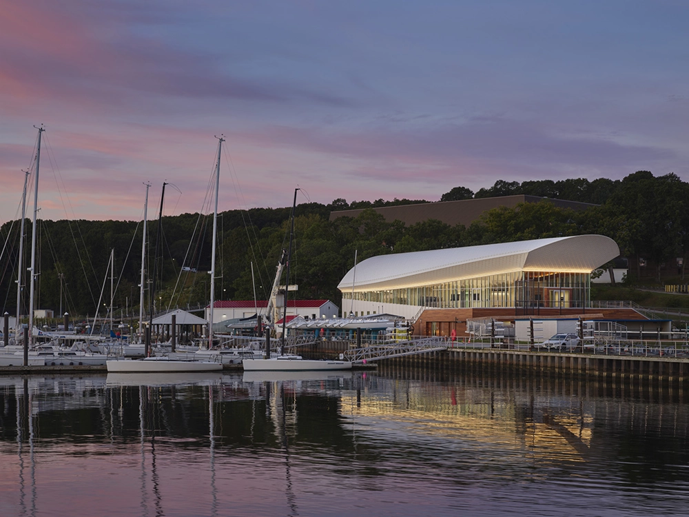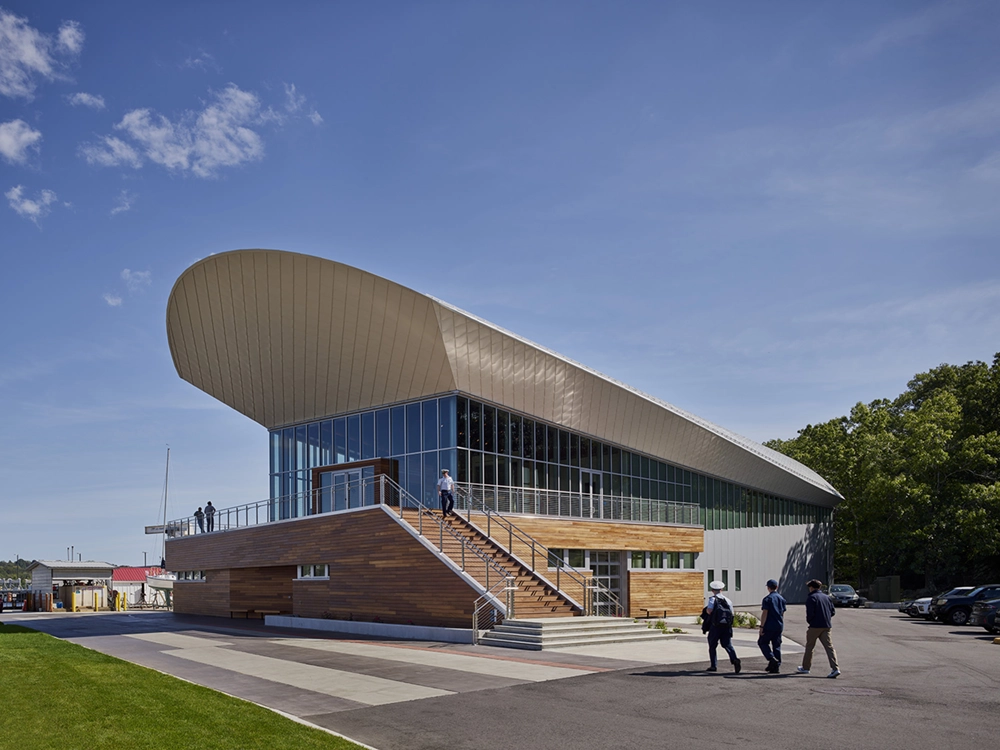 The Center also supports the maintenance requirements for the fleet of vessels employed by the sailing and professional maritime studies programs, including a multipurpose boat bay capable of accommodating two Leadership 44 training sailboats, simultaneously, and a paint booth to facilitate grinding, sanding, and applying paints and coatings. The building design conveys the maritime heritage of the Academy, creating a new iconic element. Angled from the orthogonal geometry of the waterfront bulkhead, the roof form is oriented due north, harkening to navigation traditions using the North Star.