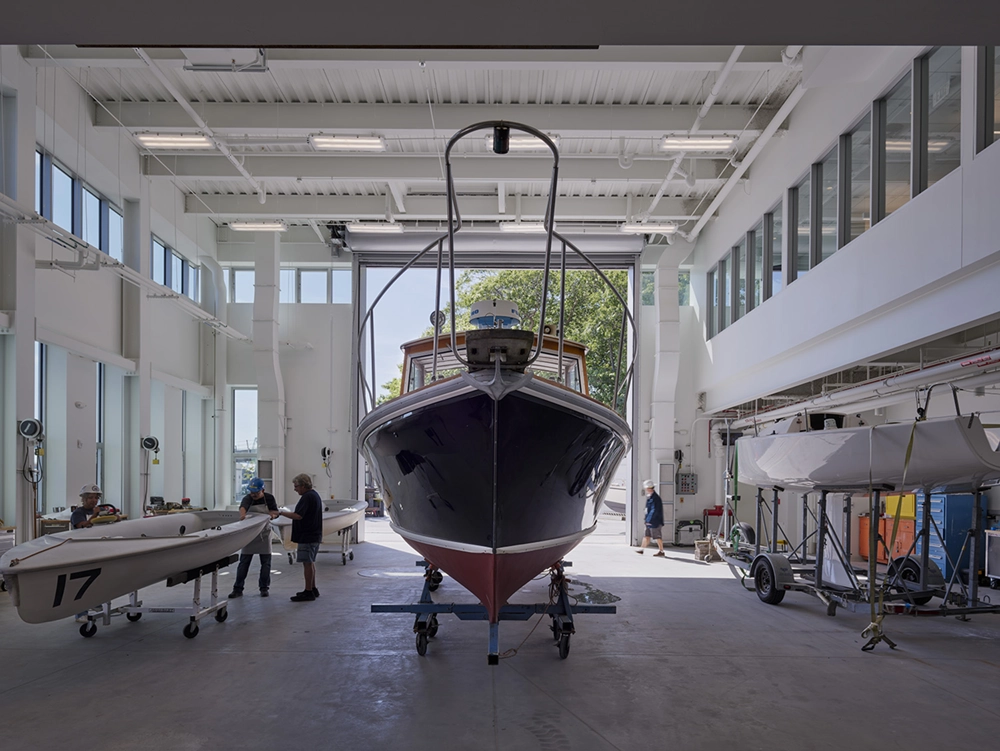 Windows into both the boat maintenance shop and the Science and Engineering Innovation Lab allow visitors to see these activities in real time. The Center uses 51% less energy than a regional median building. Compared to a code-compliant building, the Center emits 32% less greenhouse gases and uses 42% less water. Operable windows provide fresh air, allowing the interior to be naturally daylit and passively ventilated even without power. All regularly occupied spaces are daylit and have unrivaled views of the waterfront and campus.